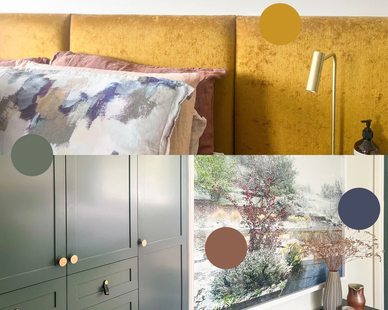 For most of us, existing colours in the bedroom will help determine the palette for a cohesive bedscape. We have a dark green wardrobe and gold velvet bedhead taking up a lot of the visual real estate in our bedroom, along with a gorgeous framed photo print taken by my Father in Alexandra, which has plenty of rich earthy tones.