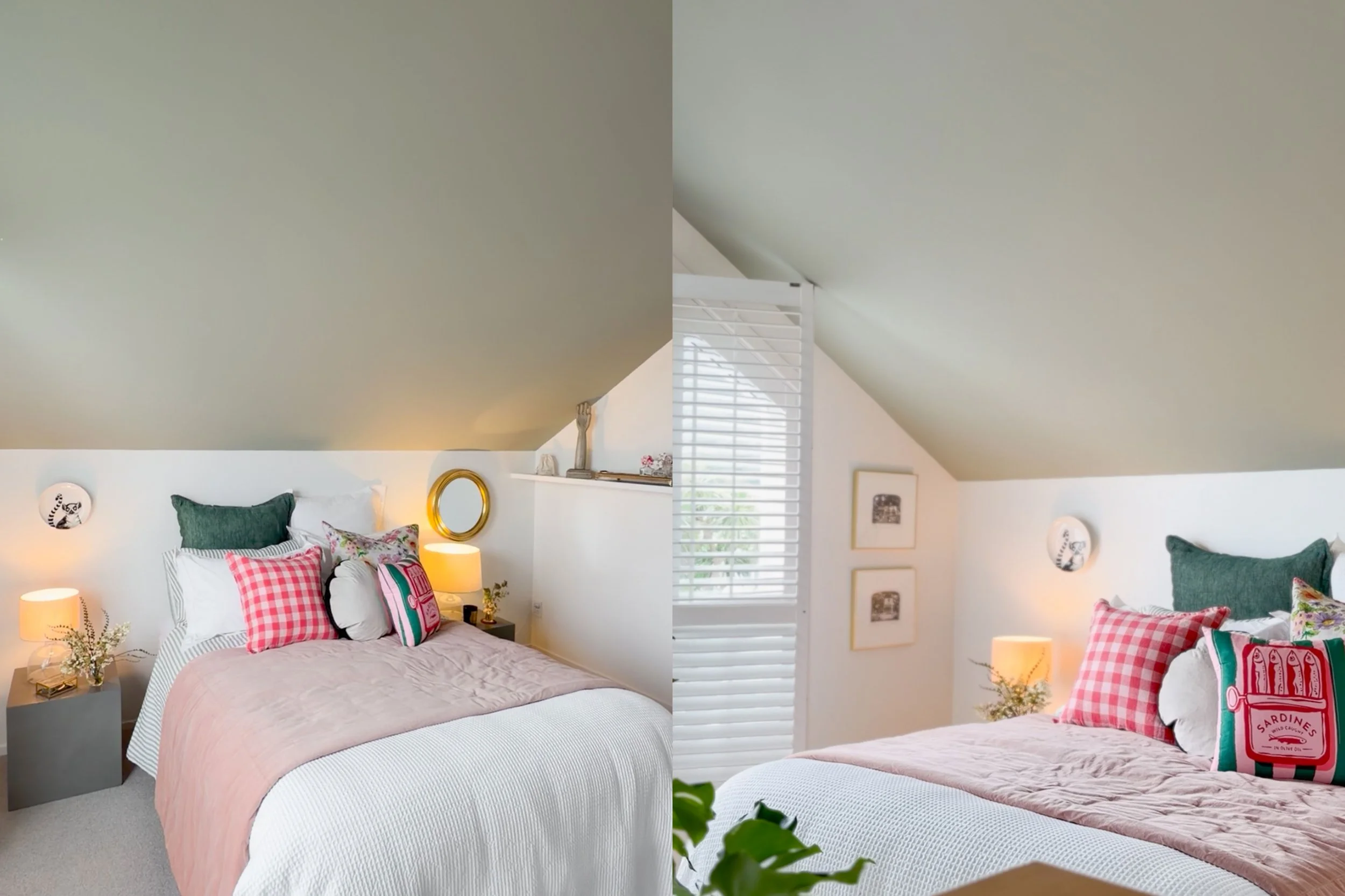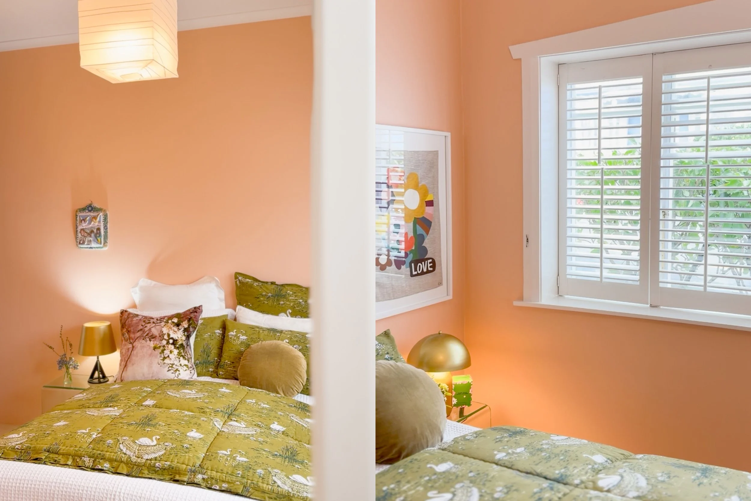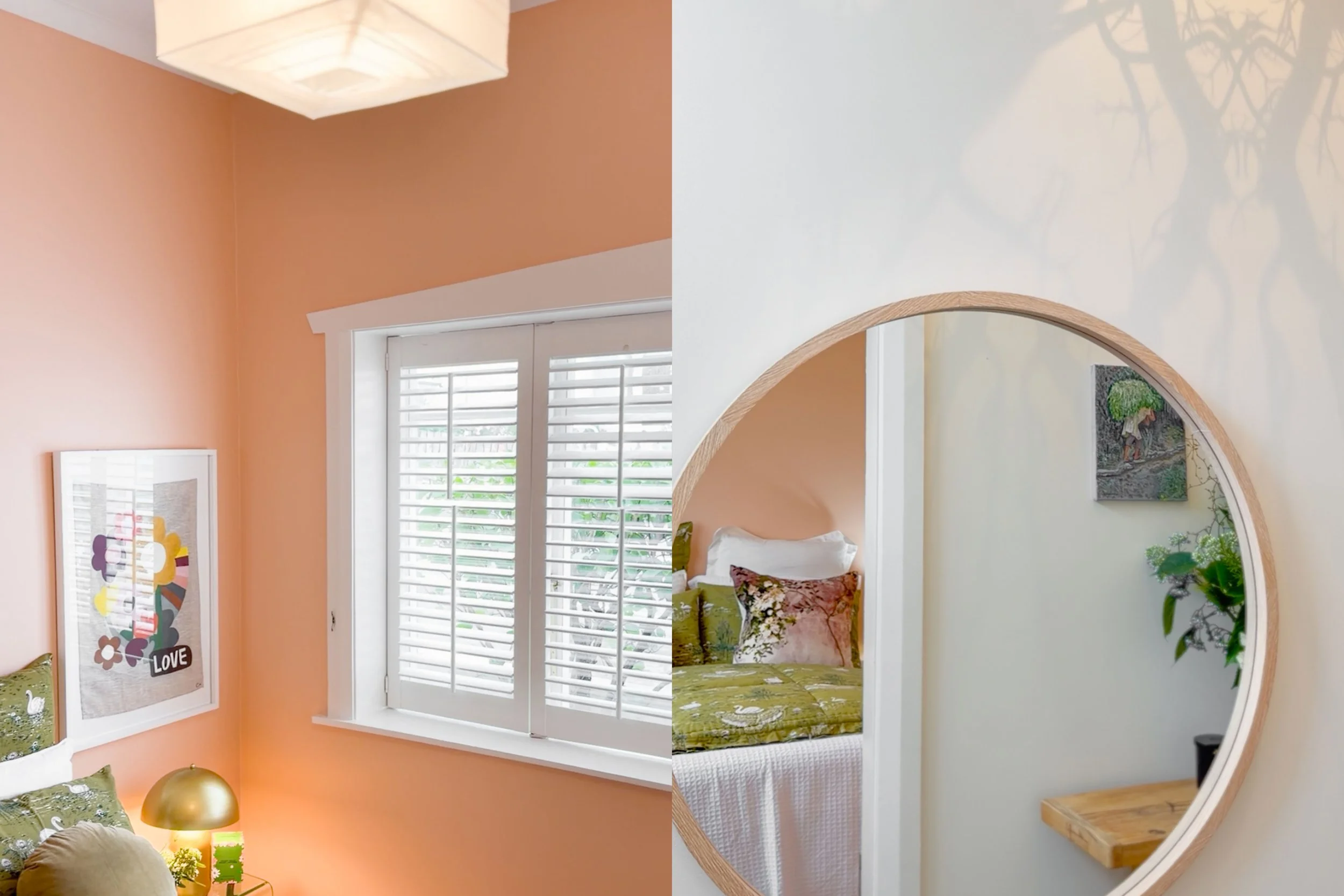 The result is a bedroom that glows, with the warm pink tones pairing perfectly with the greenery outside the window and the green bedspread that Bridgett chose. What was once a simple bedroom, is now a colourful statement and it has the effect of bouncing the natural light around the room, to create what is a really special and inviting space. Pink for the win!