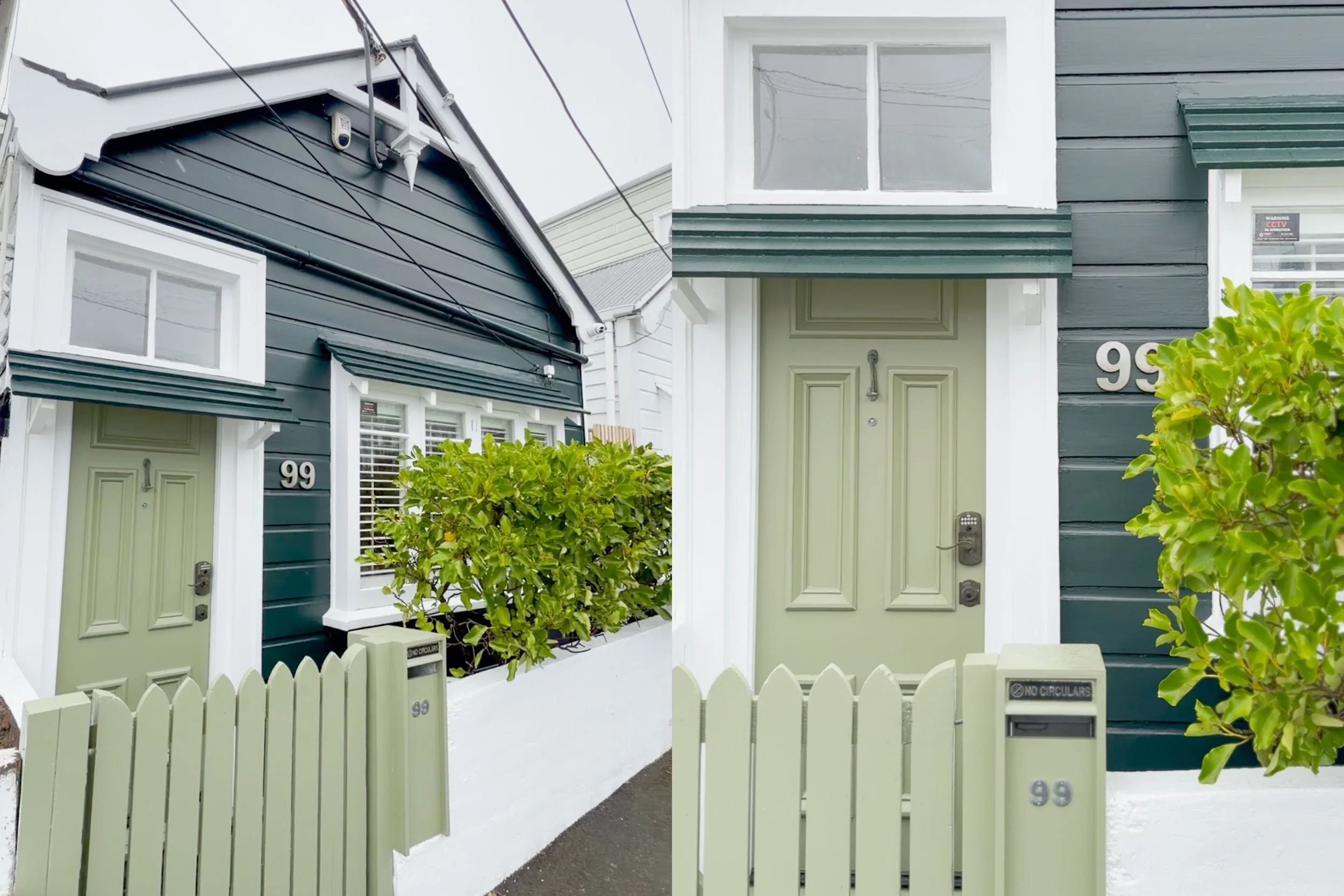 So, it was time to consult my collection of Resene paint swatches and create a shortlist. This paint selection felt like the most important one to get right, with the first impressions of potential buyers and the properties street appeal on the line. We ended up going with Resene Midnight Moss as the main paint colour and Resene Finch for the front door, gate and mailbox, with Resene Alabaster on the front fence and trims.