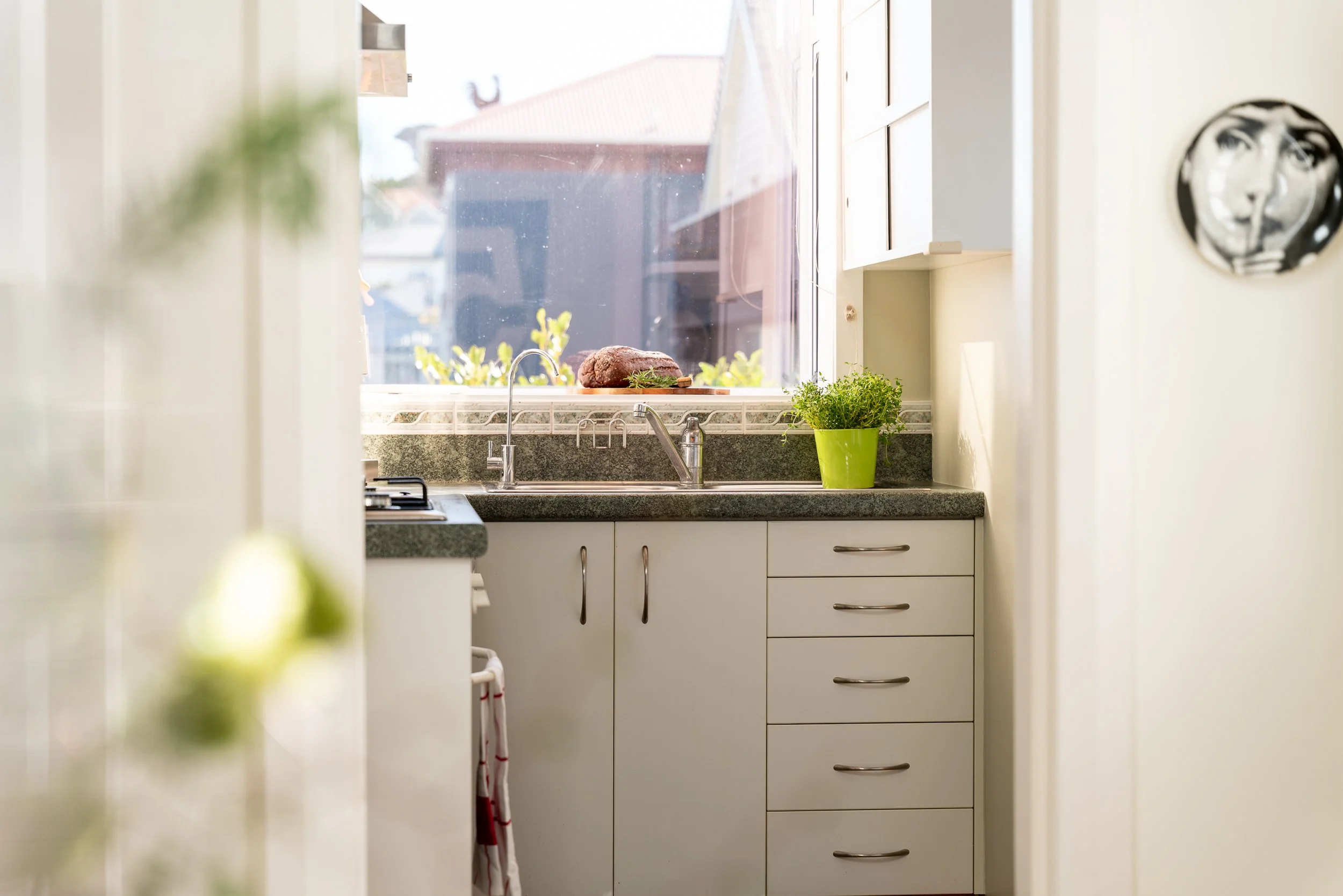 We also decided to carry this light green shade into the kitchen, making sense of the existing benchtops. This compact kitchen now has a distinct vibe and ties into the rest of the home perfectly.