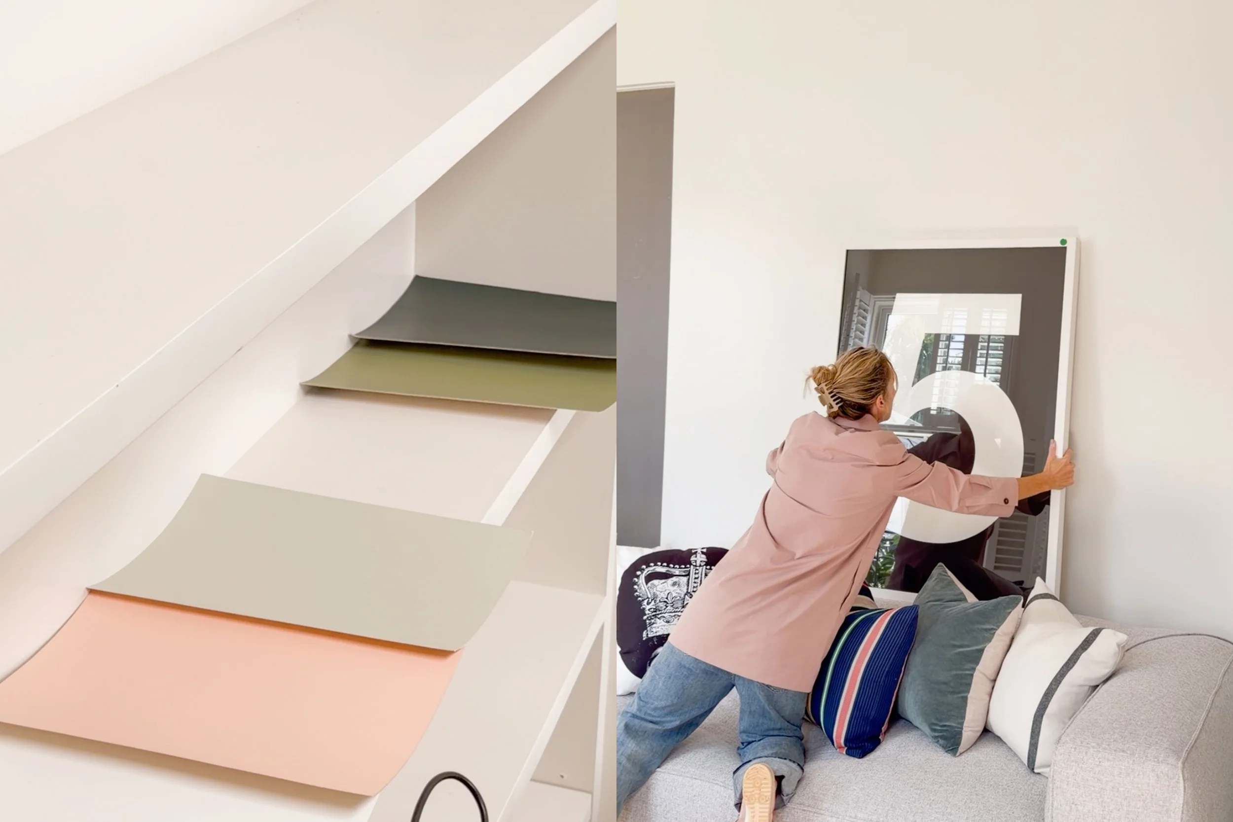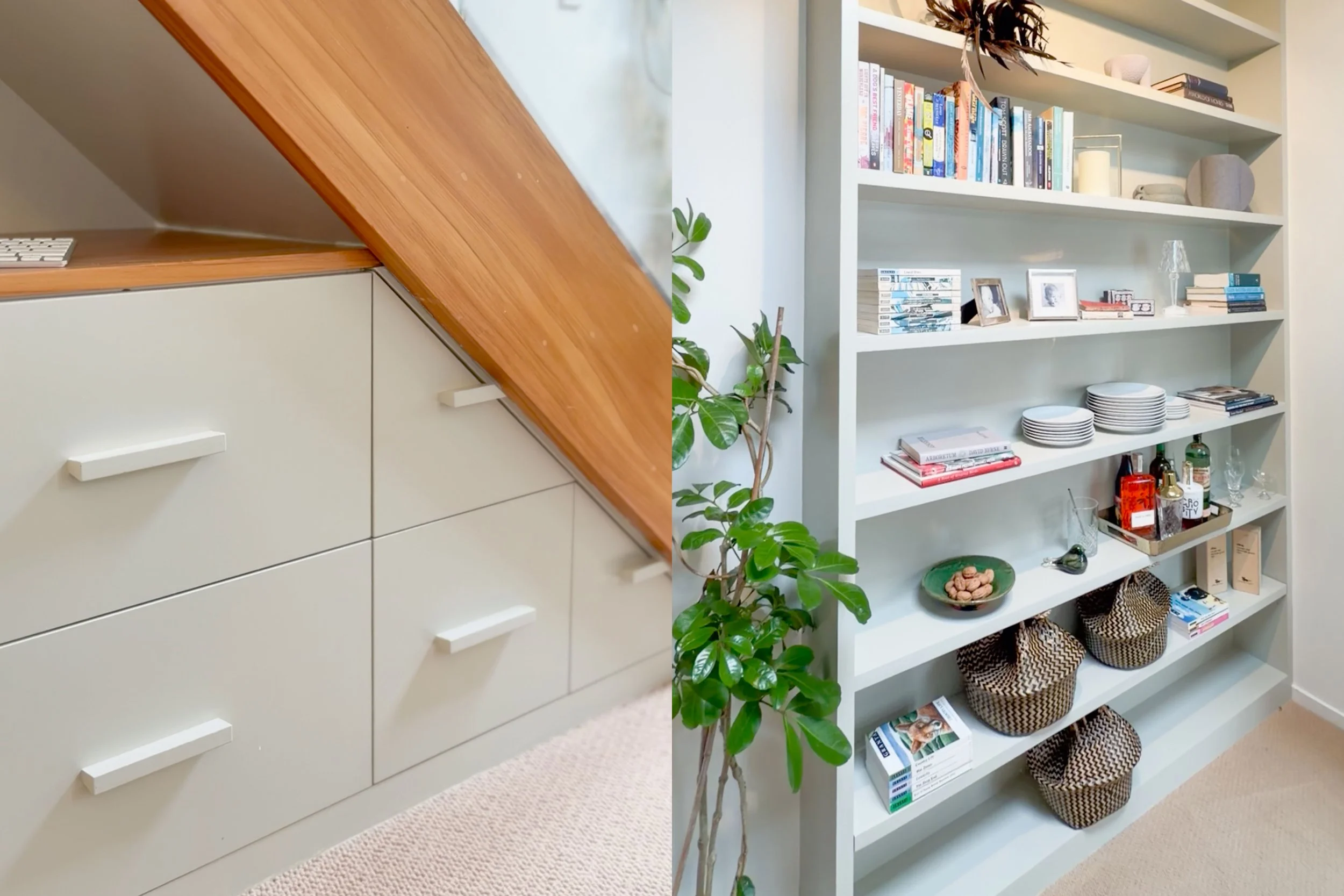 With a large built-in shelf in the living/dining area and built-in storage underneath the stairs, we had plenty of canvas for our green colour palette. Whilst it may feel like a small detail, painting these surfaces a subtle shade of green helped tie our palette together and create a consistent thread throughout the home. I was especially pleased with how the green shelf turned out, making this otherwise ordinary storage element into a subtle feature.