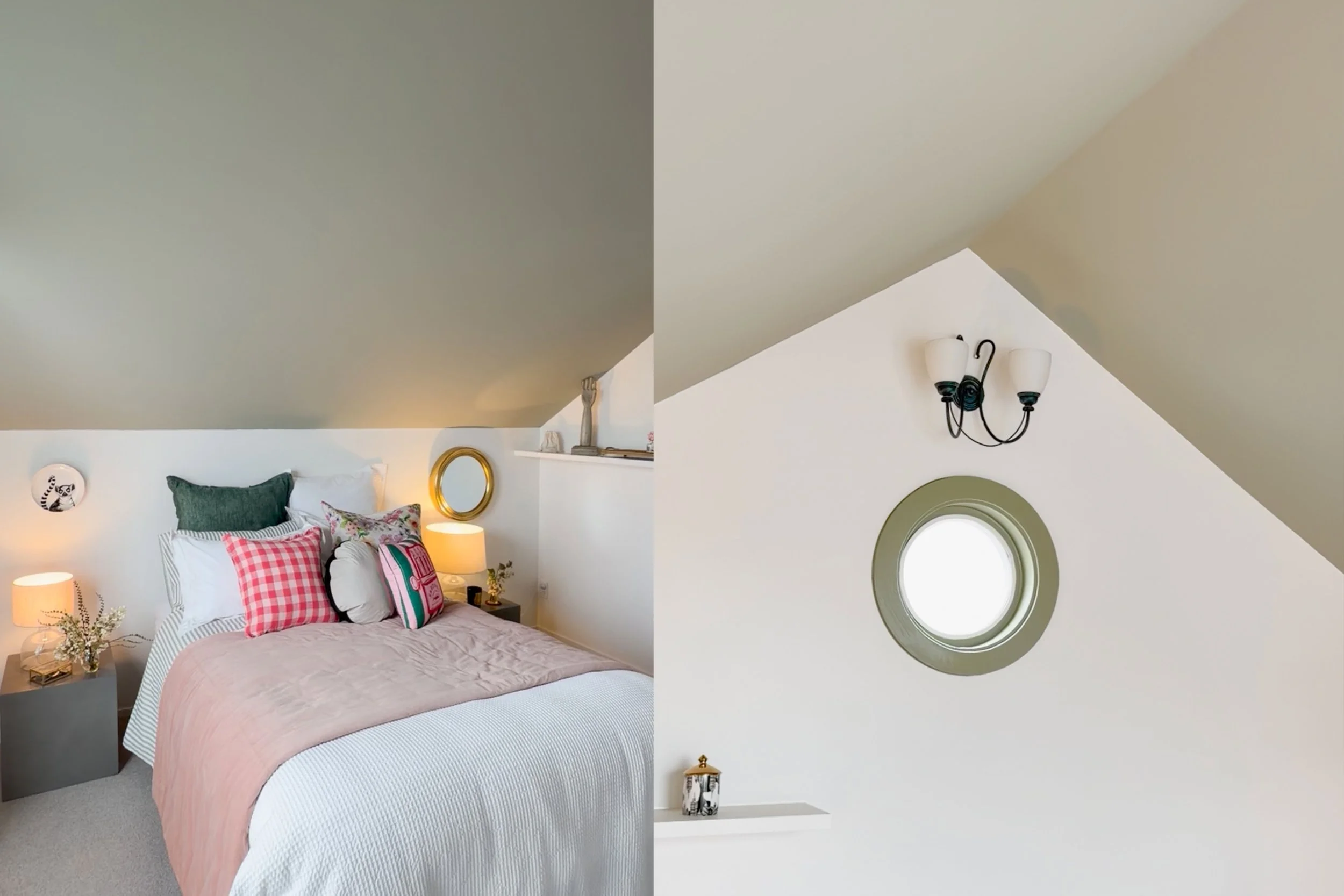 This was definitely our riskiest choice, but it paid off, transforming what was already a lovely bedroom into a sanctuary full of personality and ready for a future buyer to make it their own. We also decided to paint the small circular window frame green to tie it all together and make this quirky window a true feature.